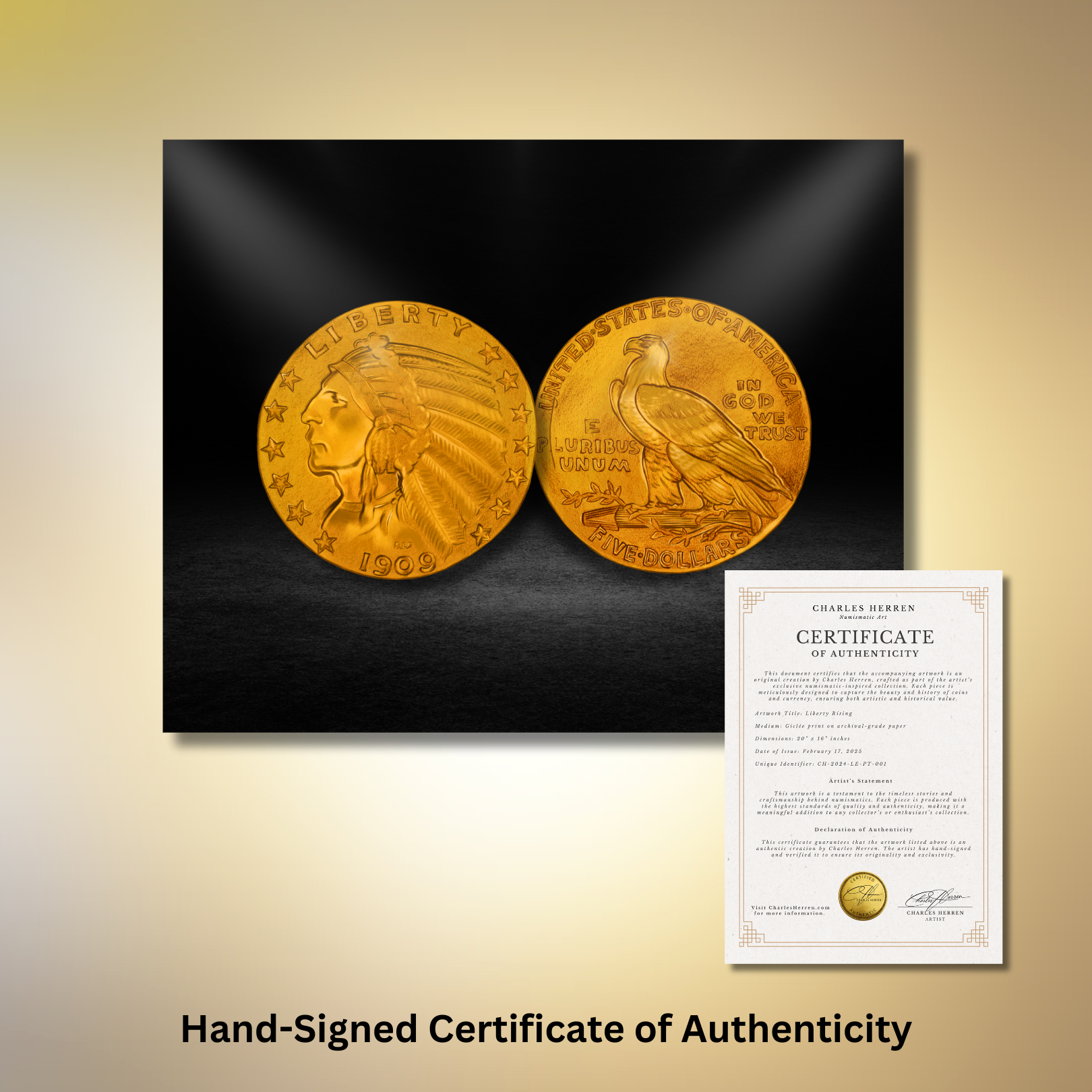 Signed & Certified: Each 14 x 11-inch coin portrait is hand-signed by Charles Herren and comes with a Certificate of Authenticity, ensuring you own a verified collector’s piece inspired by one of the most original coins in U.S. history.