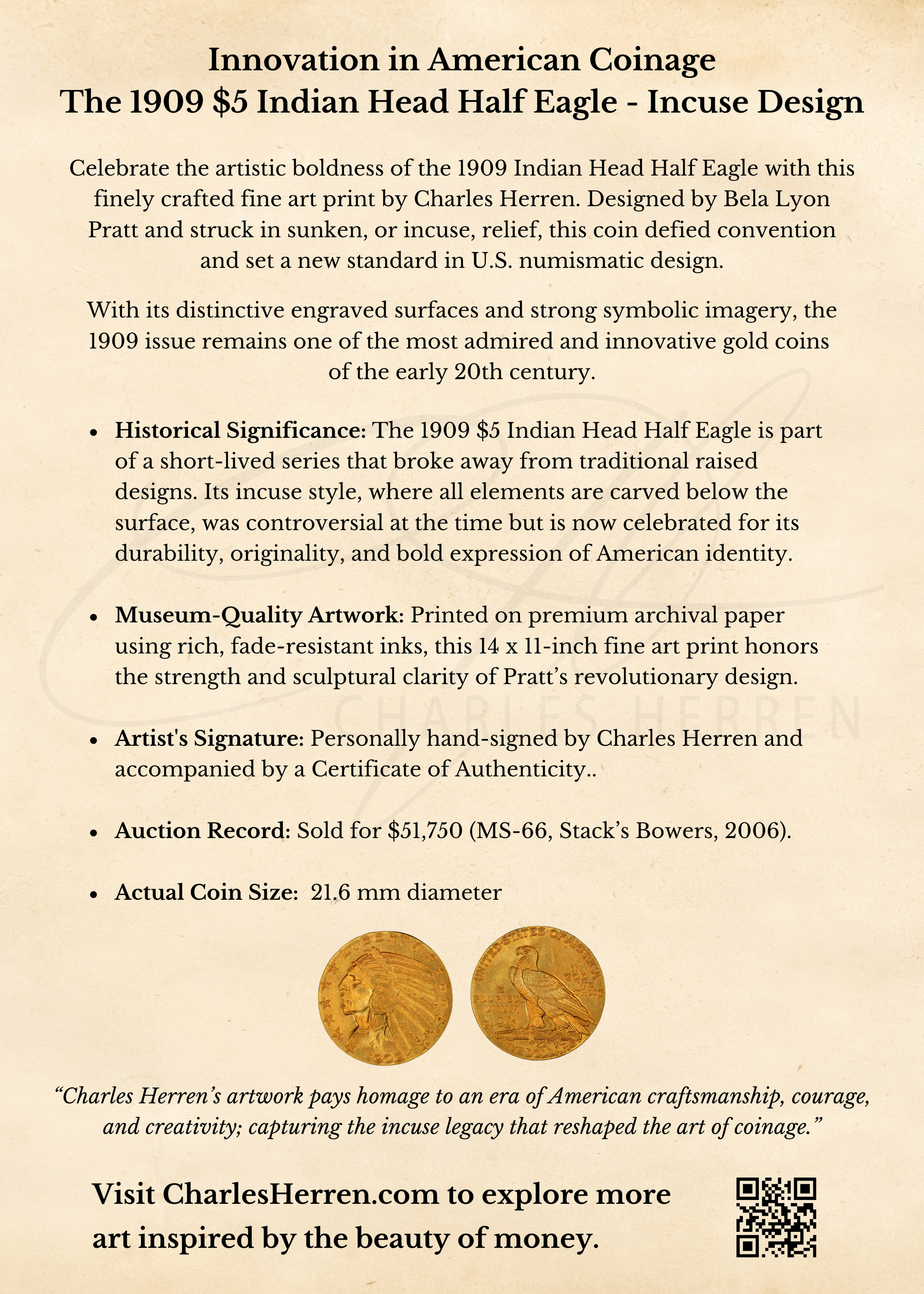 Created by numismatic artist Charles Herren, this museum-quality fine art print brings to life the 1909 $5 Indian Head Half Eagle, a coin that challenged norms with its radical sunken design and powerful symbolism.