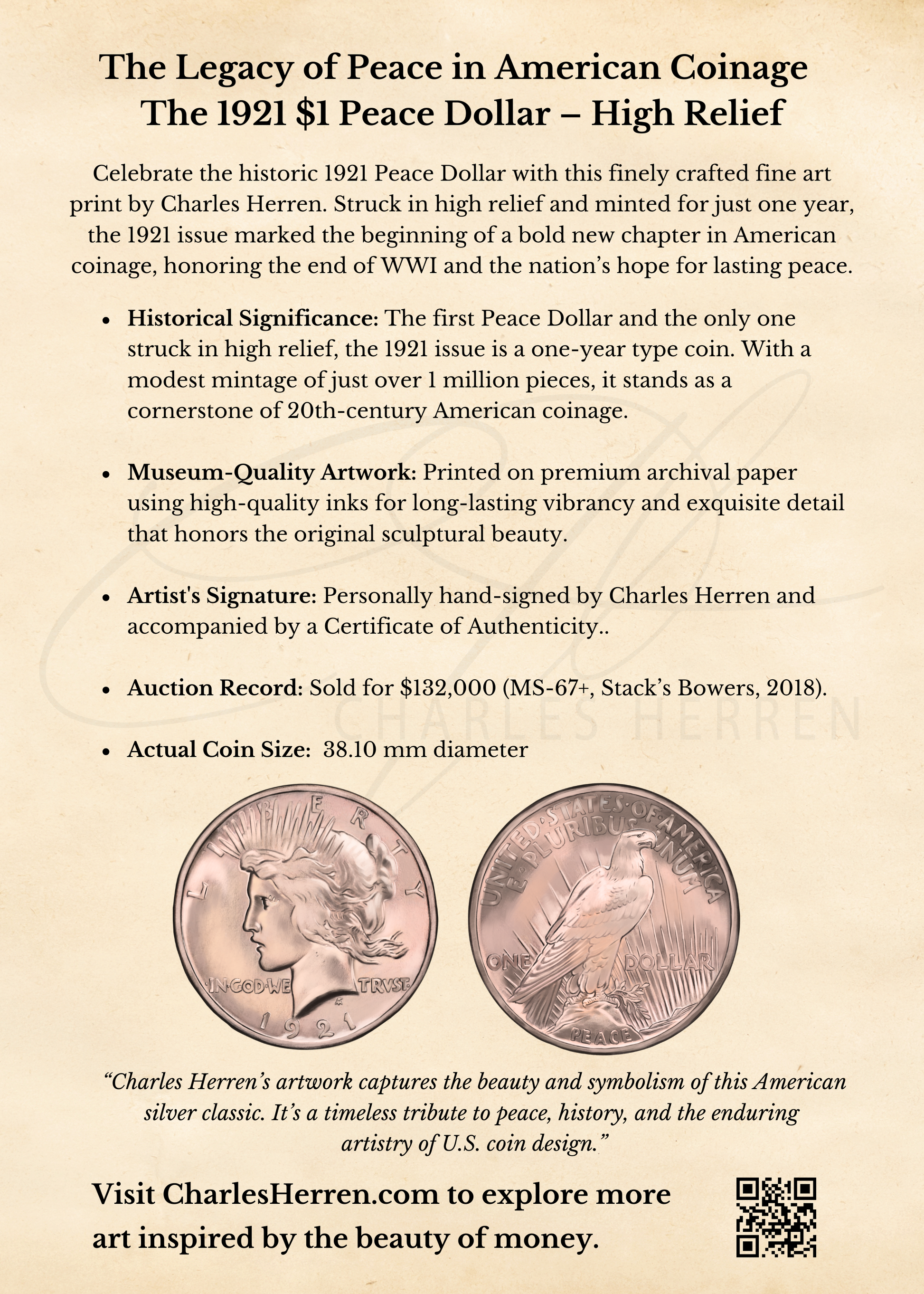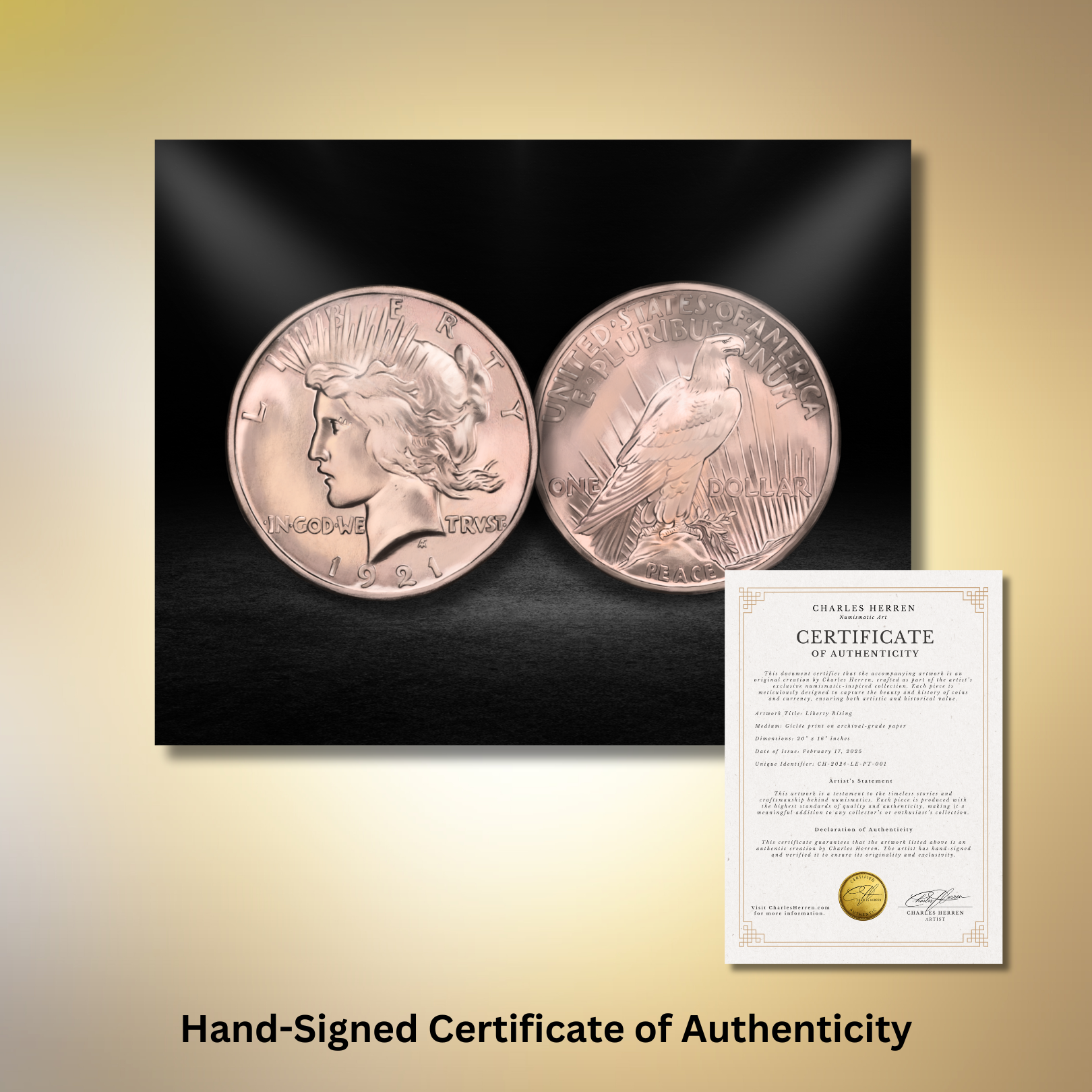Created by numismatic artist Charles Herren, this collectible 14 x 11-inch numismatic artwork faithfully renders the sculptural elegance of the 1921 Peace Dollar, struck in stunning high relief and issued for just one year.